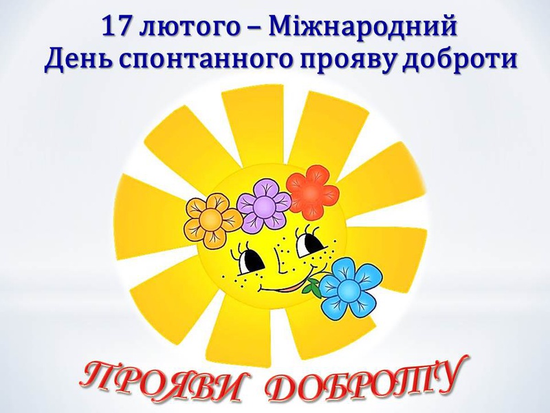 Щороку 17 лютого у світі відзначають День спонтанного прояву доброти. Це - неофіційне свято, що не має політичного, релігійного або іншого забарвлення, покликане нагадати людству про роль добра в житті кожного із нас. У 1995 році його запровадили в американському місті Денвері і з кожним роком свято почало набувати все більшої популярності. В Україні воно є новим. Метою цього дня є заохочення людей проявляти доброту до інших та світу загалом.