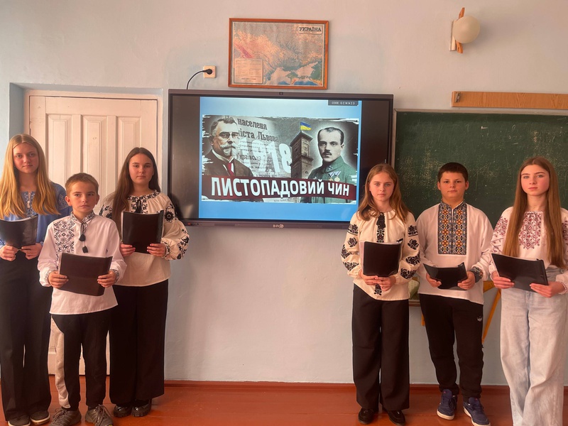 Сьогодні у школі відбулася історична година "Листопадовий чин у серці народу", присвячена Дню проголошення Західноукраїнської Народної Республіки. Учні 7 та 9 класів підготували змістовний захід, де присутні мали змогу пригадати події 1 листопада 1918 року.