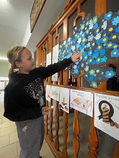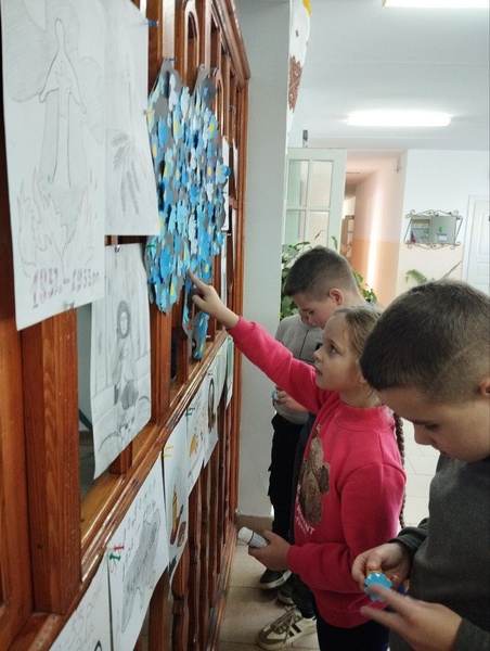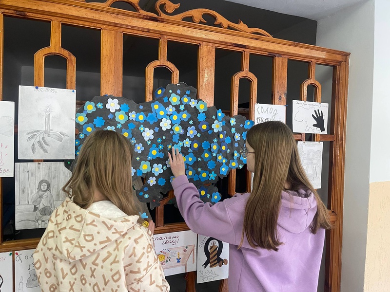 Школярі виготовили символічні незабудки — квіти пам’яті, які стали знаком скорботи, вдячності та нагадуванням про важливість історичної правди. Карта України із незабудок, розміщена у шкільному коридорі, стала тихим, але промовистим символом: ми пам’ятаємо про мільйони життів, про трагедію, яка не має повторитися.